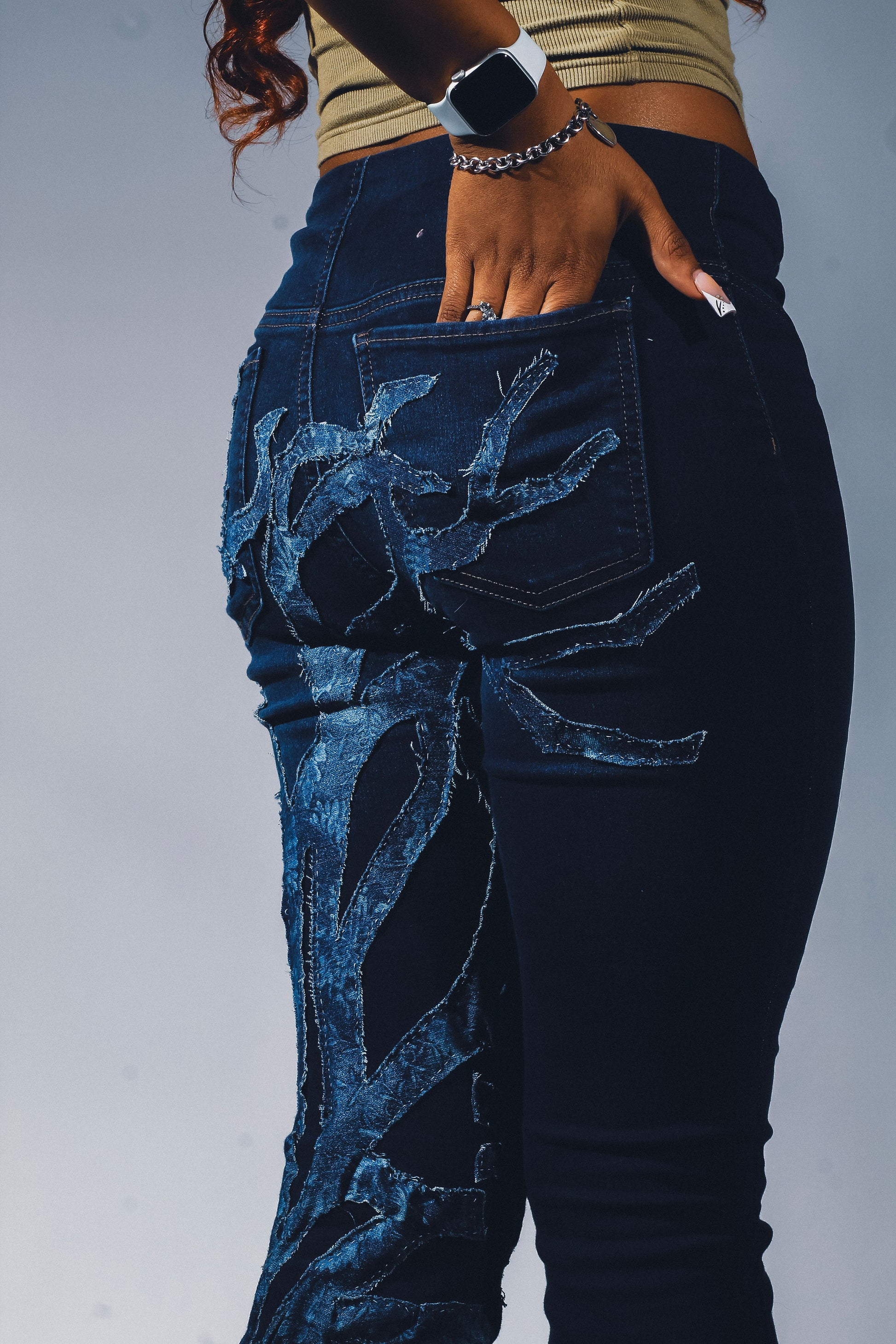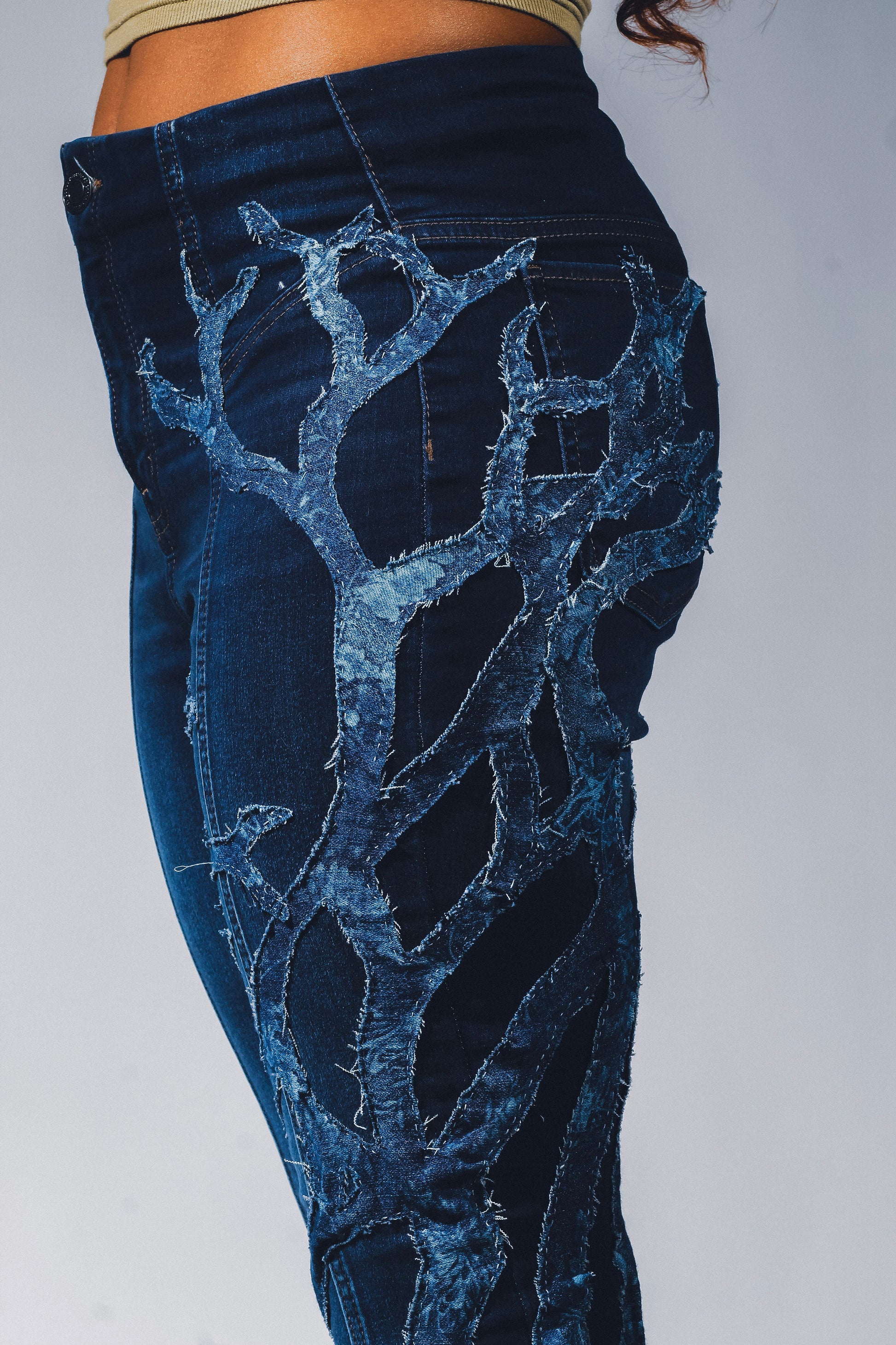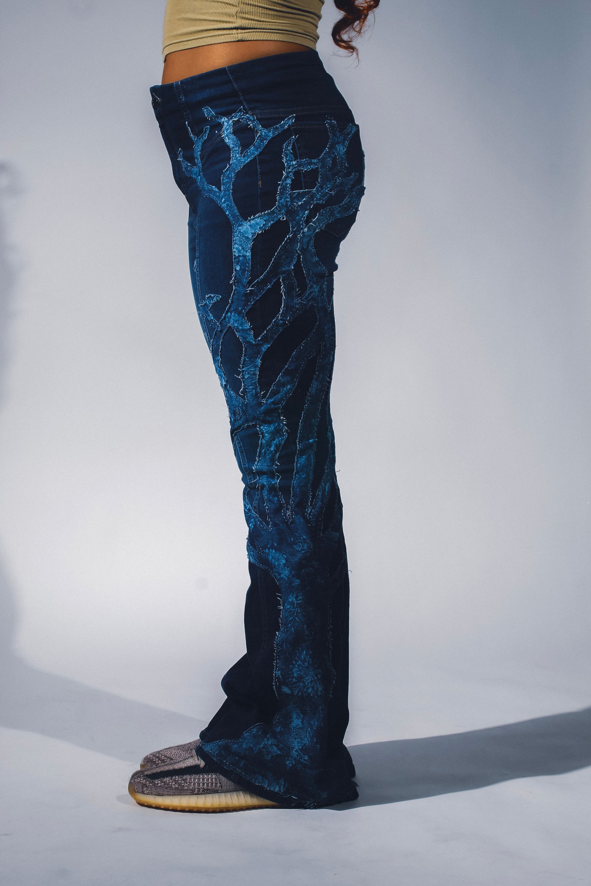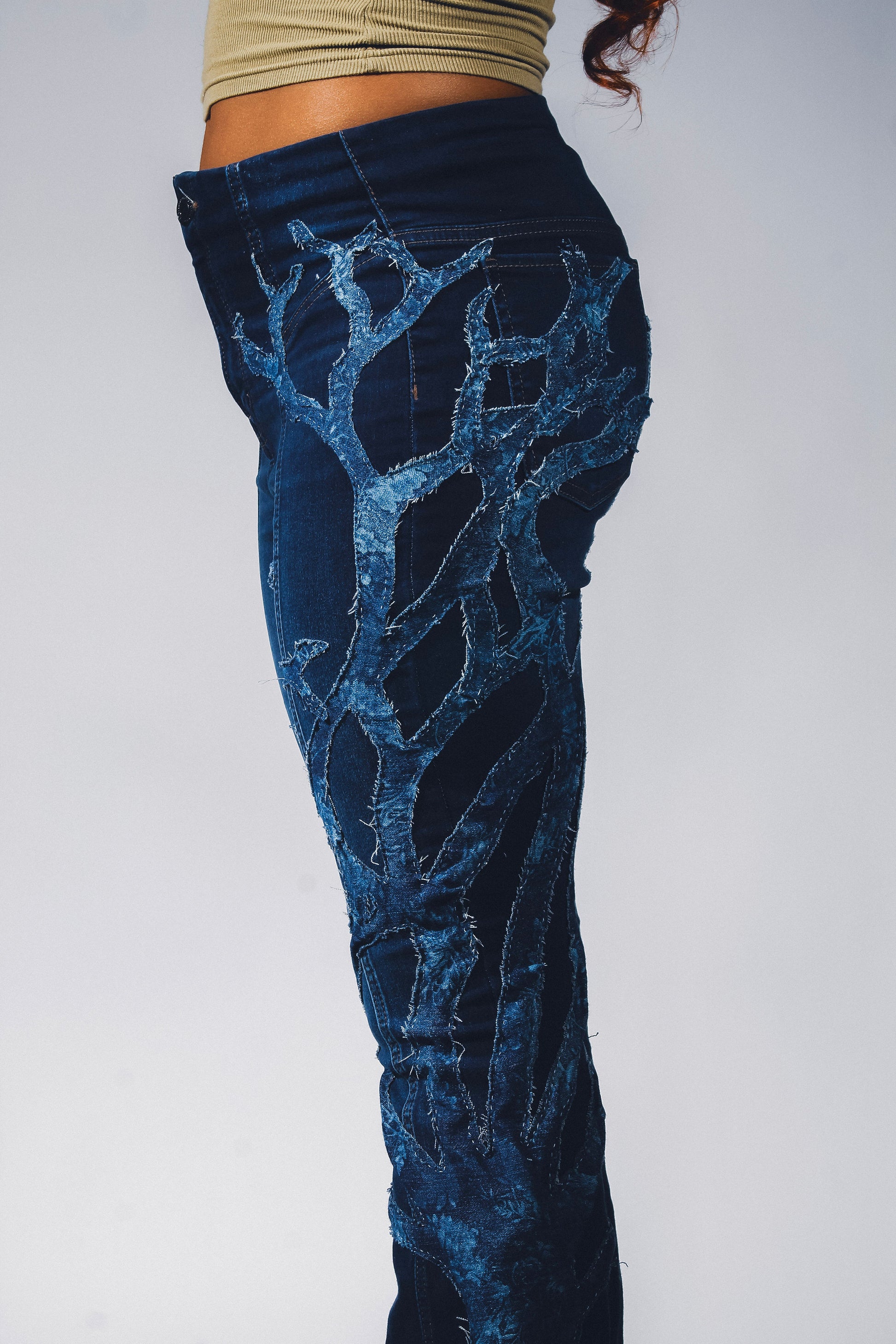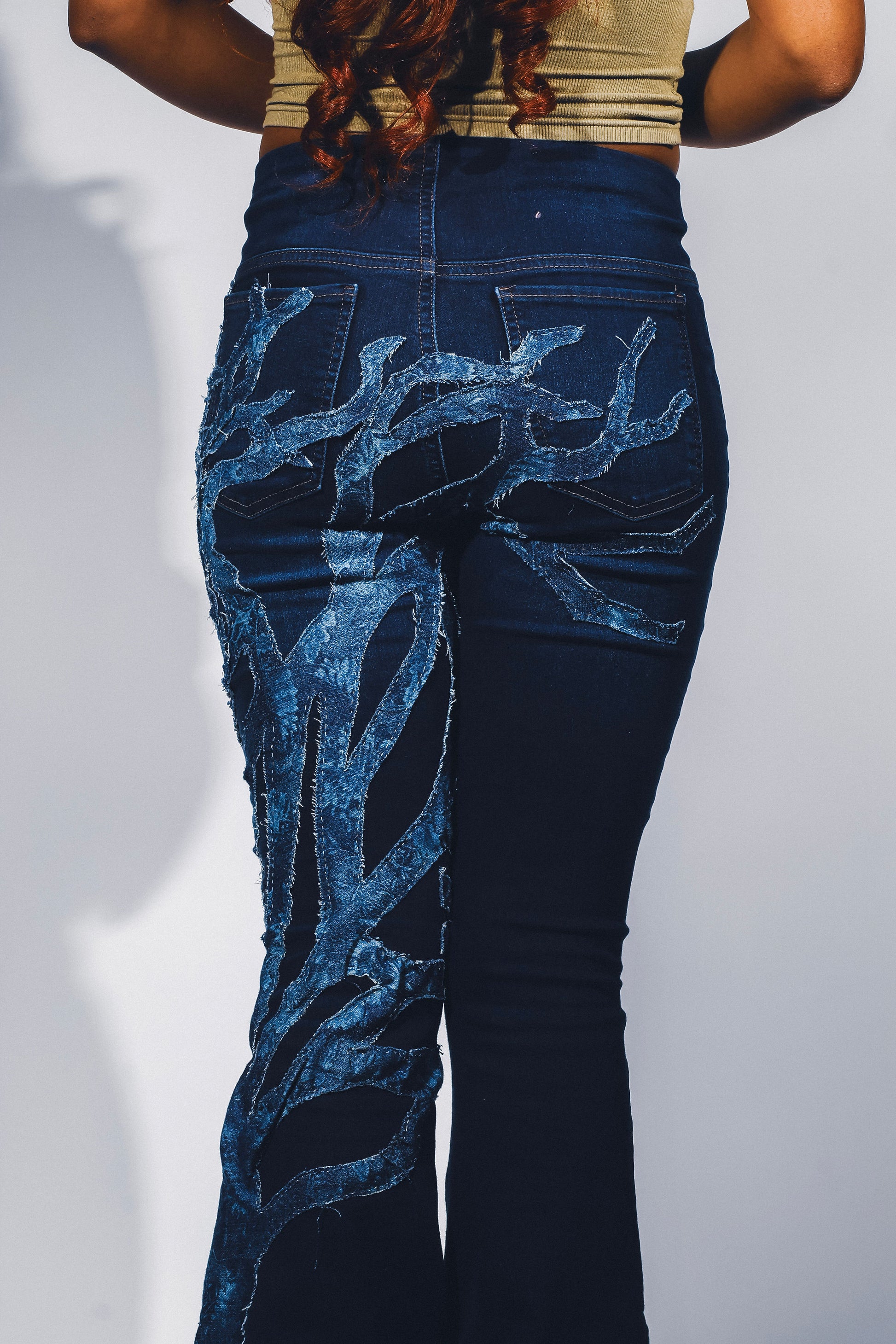 Second-hand high waisted bell bottom jeans w/ hand stitched tree design