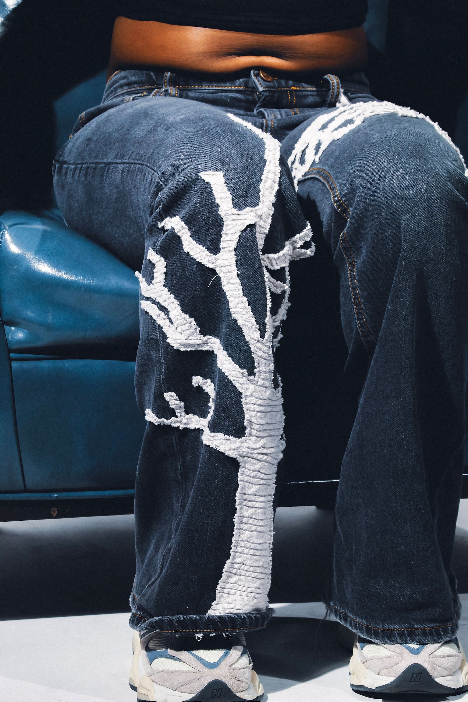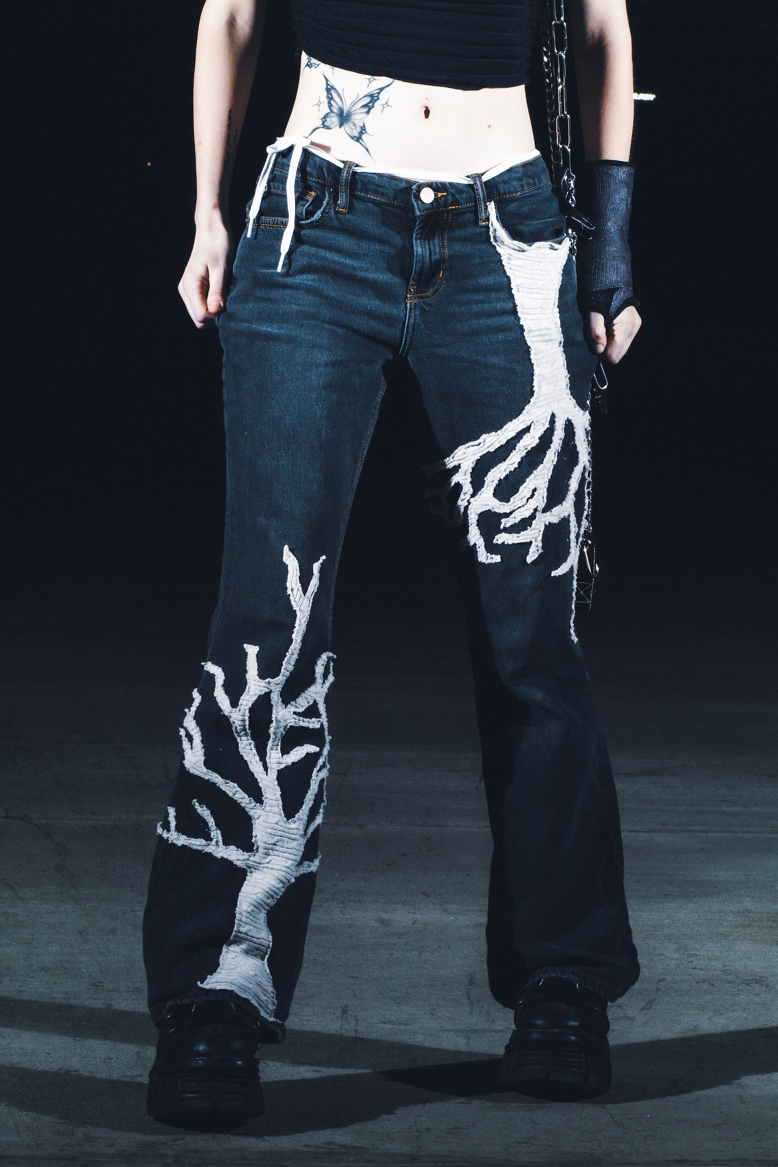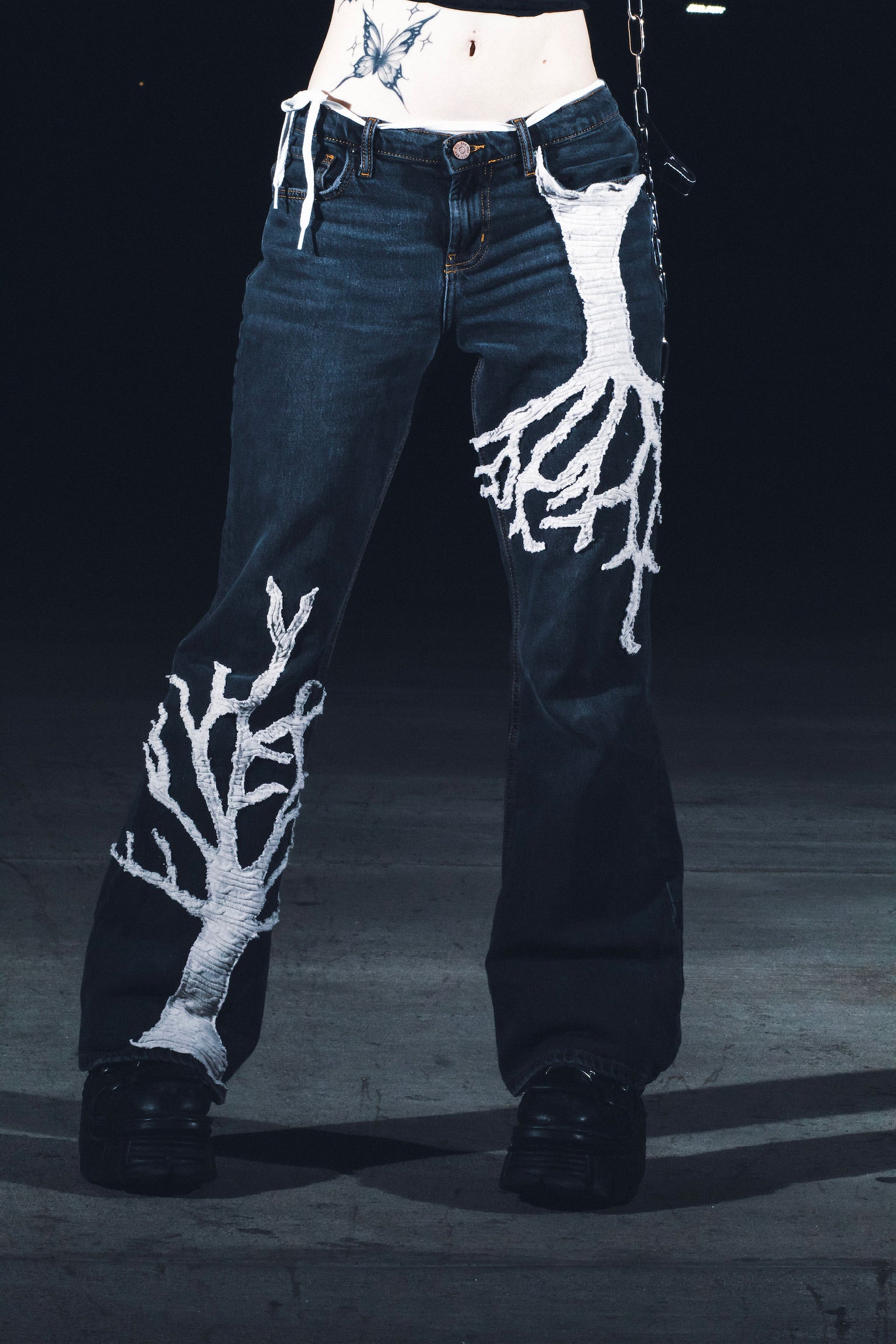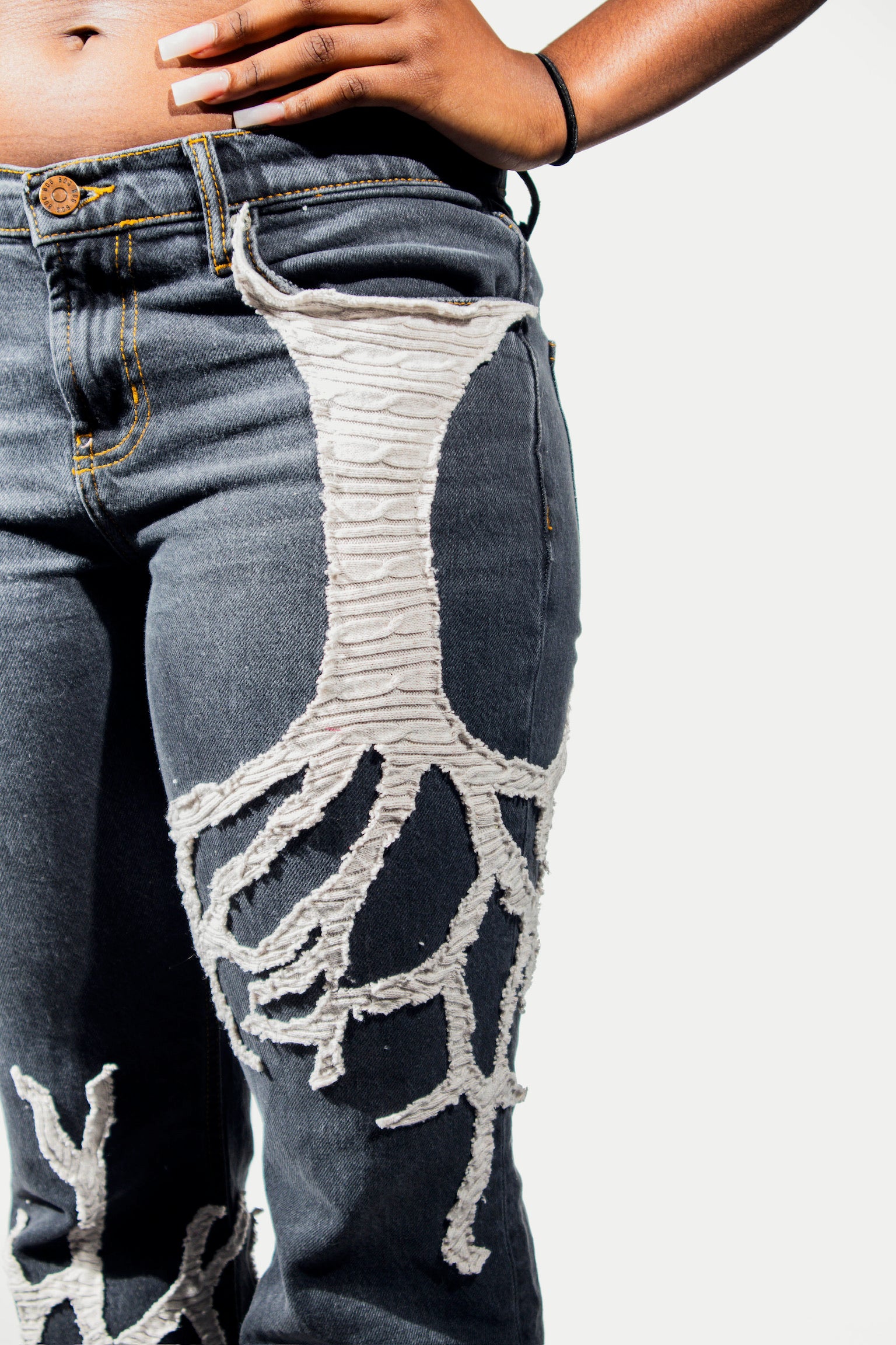 Dark wash flared jeans with two hand-stitched tree designs
